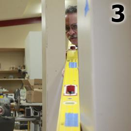 You can also check for cross-legged walls by cross sighting a jamb. If the jamb isn’t in a narrow hallway, stand to one side of the rough opening and sight across the edge of the jamb nearest you to the opposite edge of the jamb farthest from you (Fig.3). You’ll need to move your head in order to sight along both edges. Once your head is positioned, look up and down the edge of the nearest jamb. The edge of the farthest jamb should remain parallel. If it doesn’t, the walls are cross-legged; you can see how much the walls must be moved in order to correct the condition.