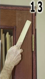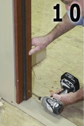 To relieve the tension on the top hinge and jamb, replace one of the top hinge screws with a screw long enough to penetrate the jamb and the wall framing (Fig.12).